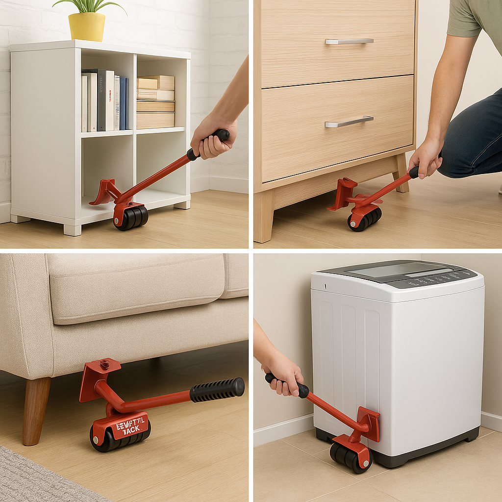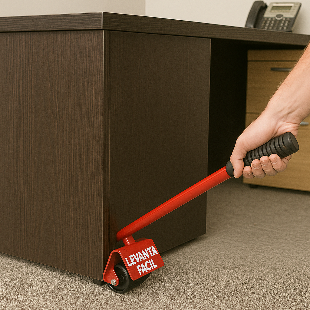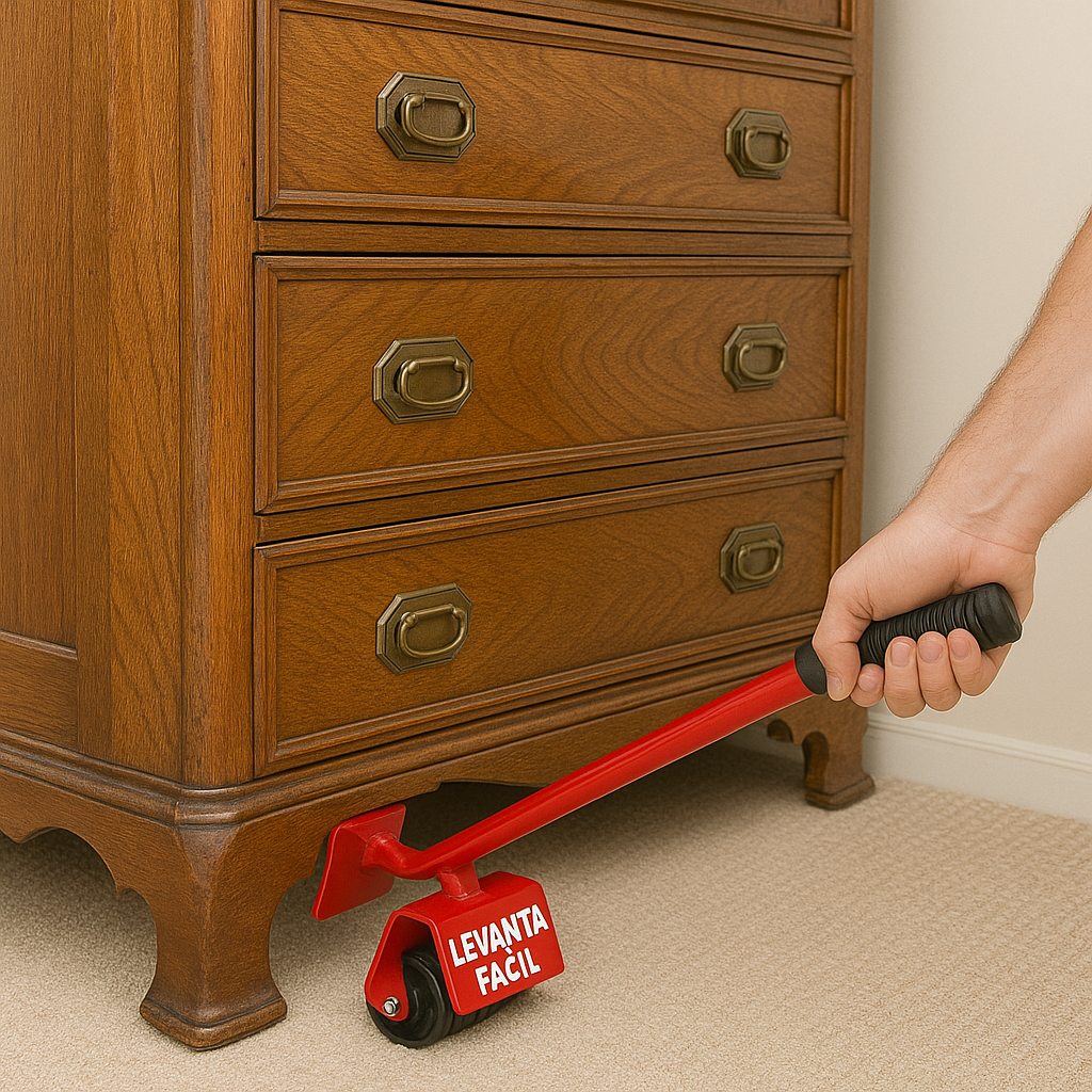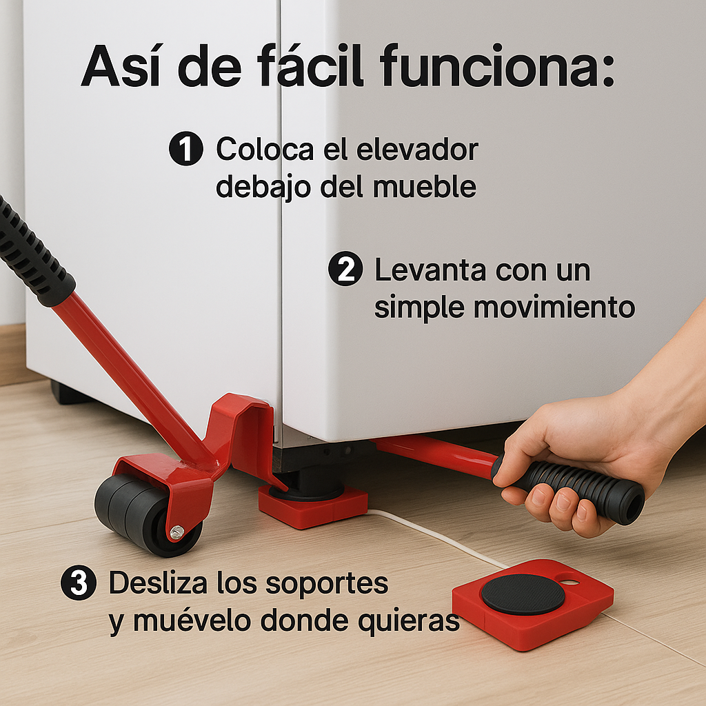 ¡Muy fácil! Solo coloca la palanca debajo del mueble, levanta suavemente y desliza las bases con ruedas. En segundos puedes mover todo sin cansarte.