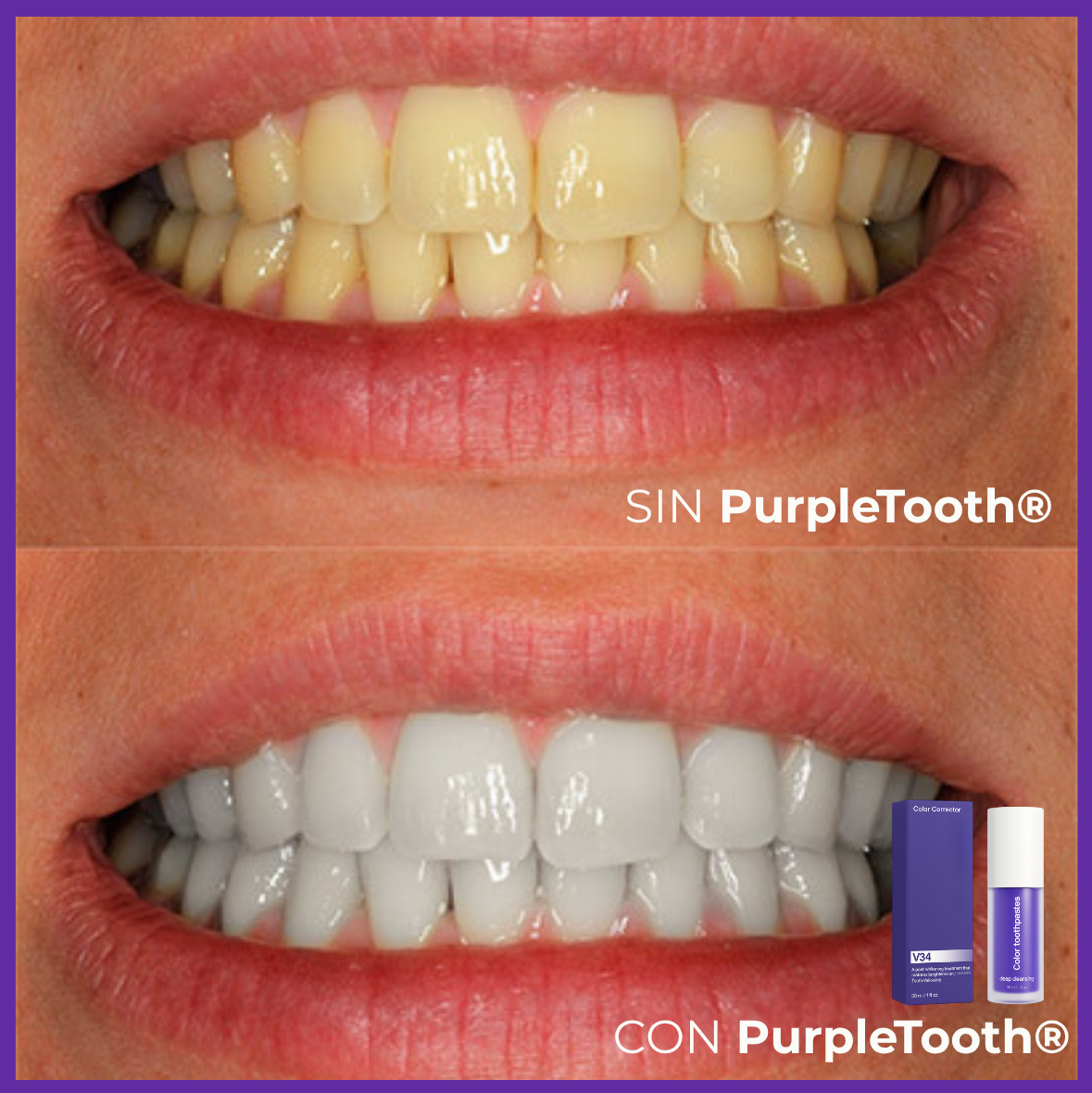 PurpleTooth® utiliza tecnología de corrección de color violeta para neutralizar los tonos amarillentos y resaltar el brillo natural de tus dientes .